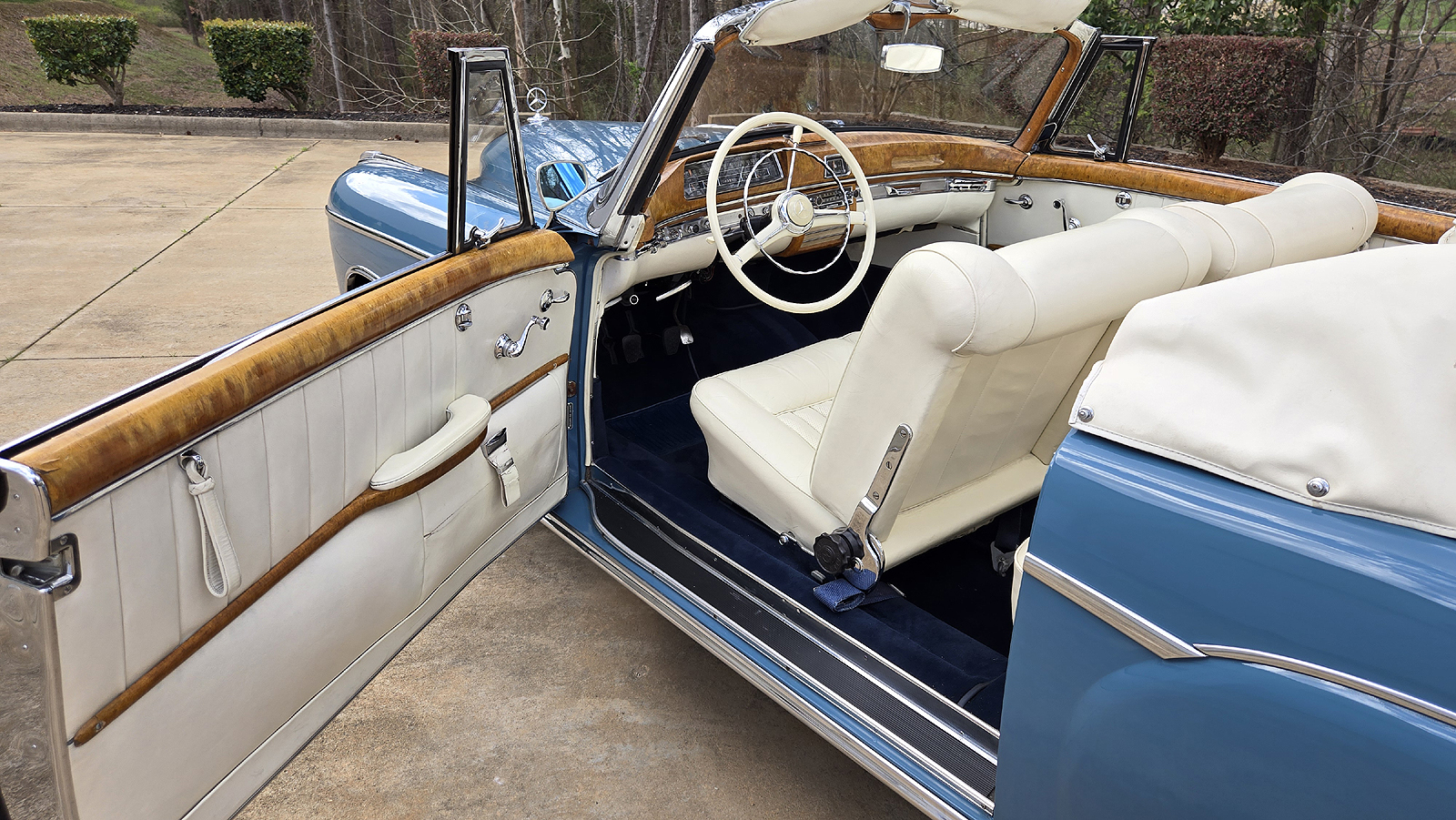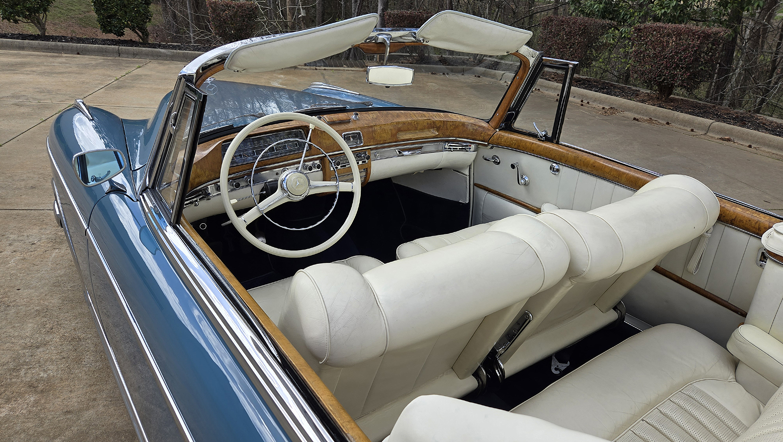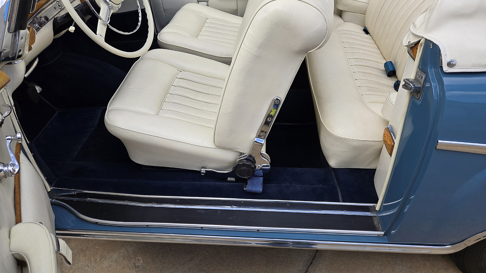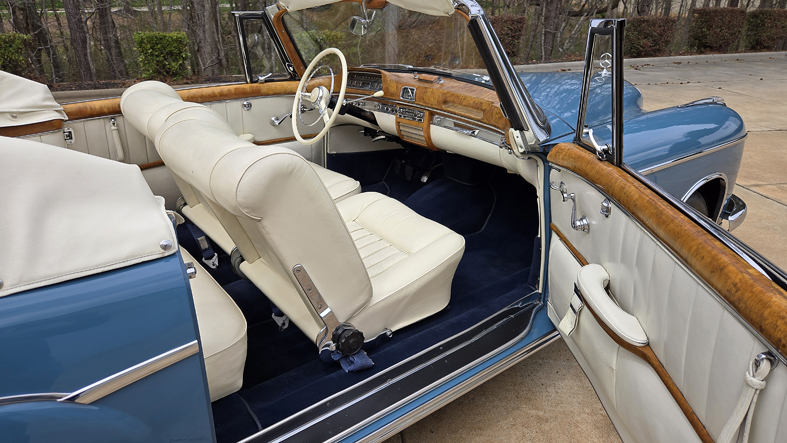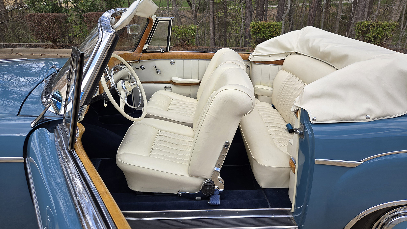 We drove this car extensively and about 400 plus miles, showing and driving the car at the 2025 Shelton Vineyards Mercedes-Benz show at highways speeds of 80mph. In addition, driving it to local car gatherings, as well as driving it around town. It is exceptional to drive. The column 4-speed shifter engages perfectly, and the clutch feels great with no shutter. The engine is quiet as can be with no valve train noises or unusual noises. In addition, the car has excellent power and can keep up with modern traffic but to be forewarned this car attracts a lot of attention. The power steering also feels strong and the car drives straight and does not wonder going down the road at all. This Ponton holds temperature well and the cream seats keep the car cool. The brakes on this car stop straight, as they should and it does not pull in either direction. The soft top has a nice zip outside window which provides a nice air floor when driving with the convertible top. The seats in this car are so unbelievably comfortable, so that when you are driving you actually forget that you are driving in a nearly 70-year-old Mercedes-Benz. There is adequate room for 4 adults in this car as well. This wonderful Mercedes-Benz 220S Cabriolet can be shown, but it is a high-level driver/show car and is a great driver’s car as it really shines nicely on the road. It needs and should be driven as all our cars need to be. The next owner will be sure to have plenty of miles of driving enjoyment and touring with this exceptional 1959 Mercedes 220S Cabriolet “Ponton.”