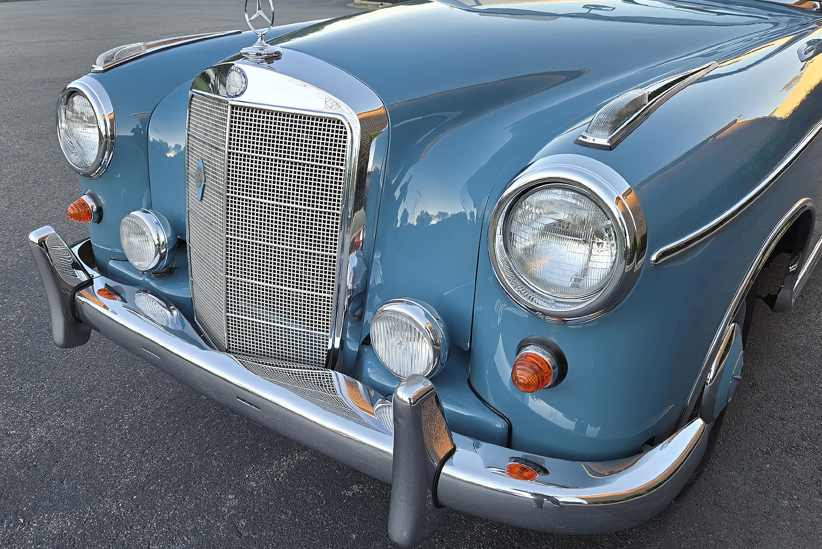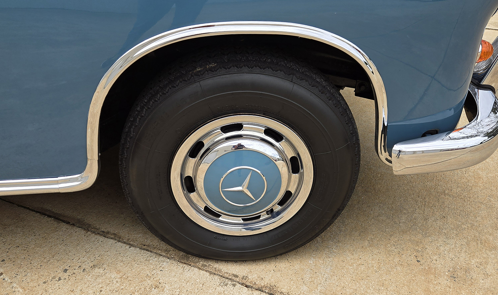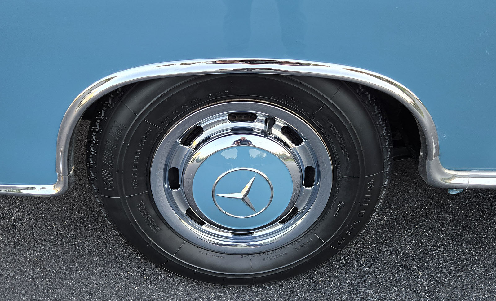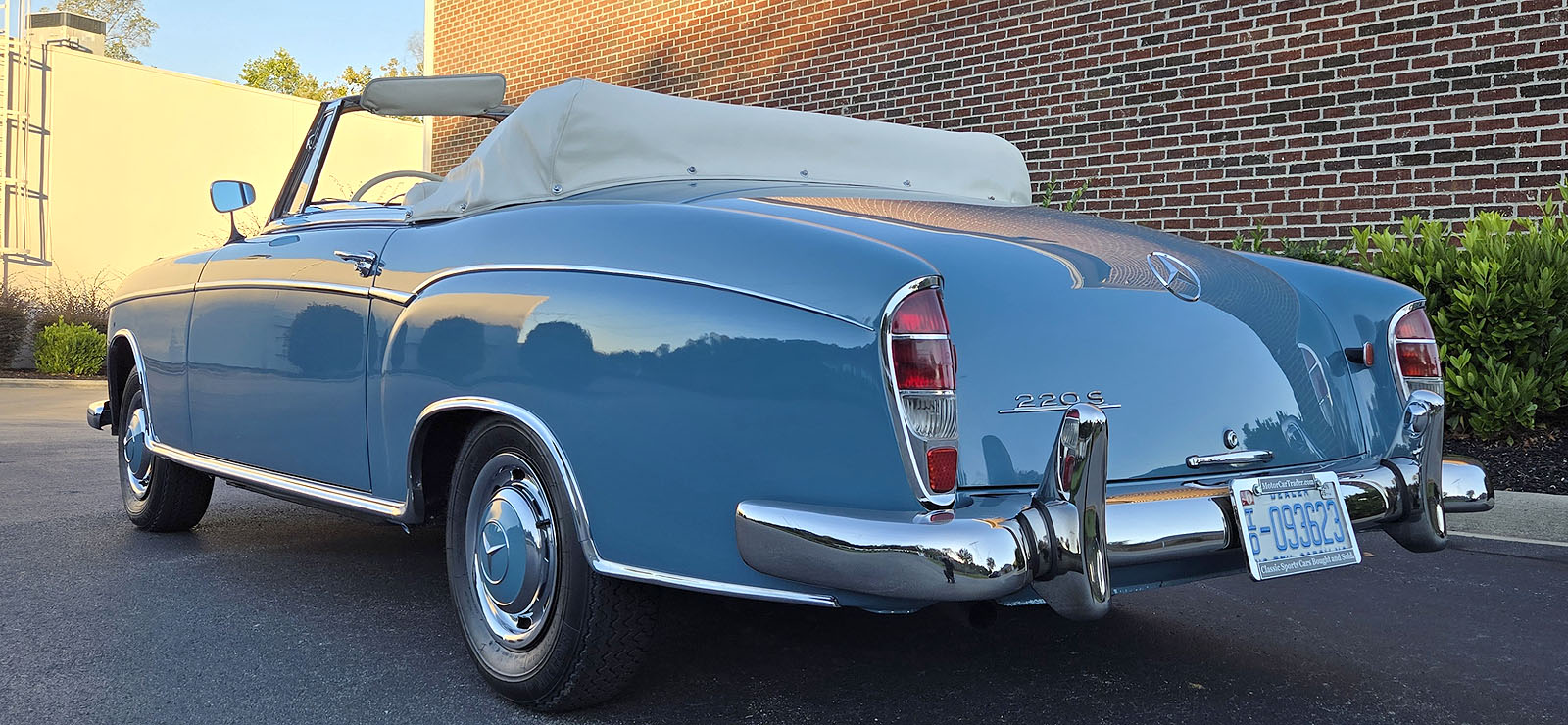 We acquired this Mercedes Ponton from a Mercedes collector. The prior owner took excellent care of this car and presented the car at several car shows. Since our purchase, we have completed some work to improve the overall condition of the car both cosmetically and mechanically. We purchased new Michelin 185 R13 radial tires. The new tires were balanced on the wheels, and an alignment was performed. In addition, we had to recore the original radiator, as it had a few leaks. A timing adjustment was performed, and the original carburetors were tuned and adjusted as needed. A tune up was done with spark plugs installed. We did check the compression when the spark plugs were replaced, and the result was excellent of 142 psi to 154 psi across all 6 cylinders. Furthermore, the driver side window mechanism needed repair and to be welded, so we properly addressed this as well. A new manual auxiliary fuel pump was installed for easier starting function. We installed a new rear end seal, where the drive shaft meets the rear differential as it was leaking. This Mercedes-Benz went through an extensive detail with the interior cleaned, leather extensively refreshed/protected and cleaned. The exterior of the car was detailed, buffed and polished as well. All chrome on the car was polished by hand. The canvas soft top was also cleaned with fabric cleaner. Lastly, the underside was wiped down and cleaned, where there is no rust anywhere on this gorgeous Mercedes 220S.