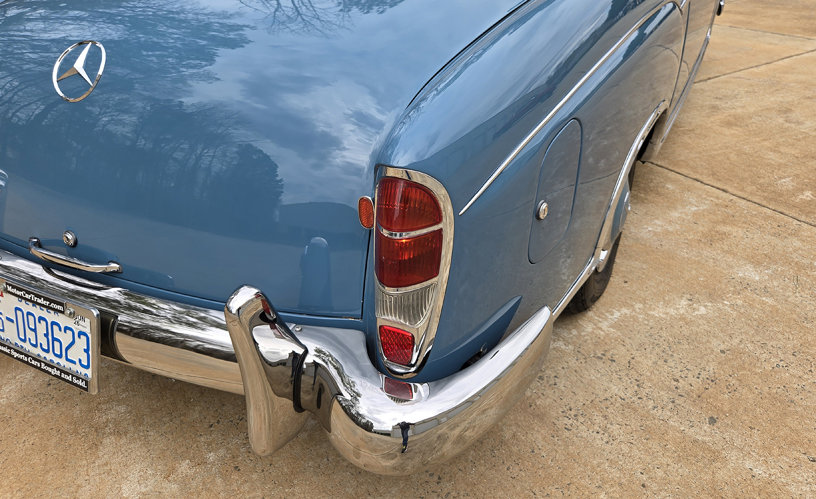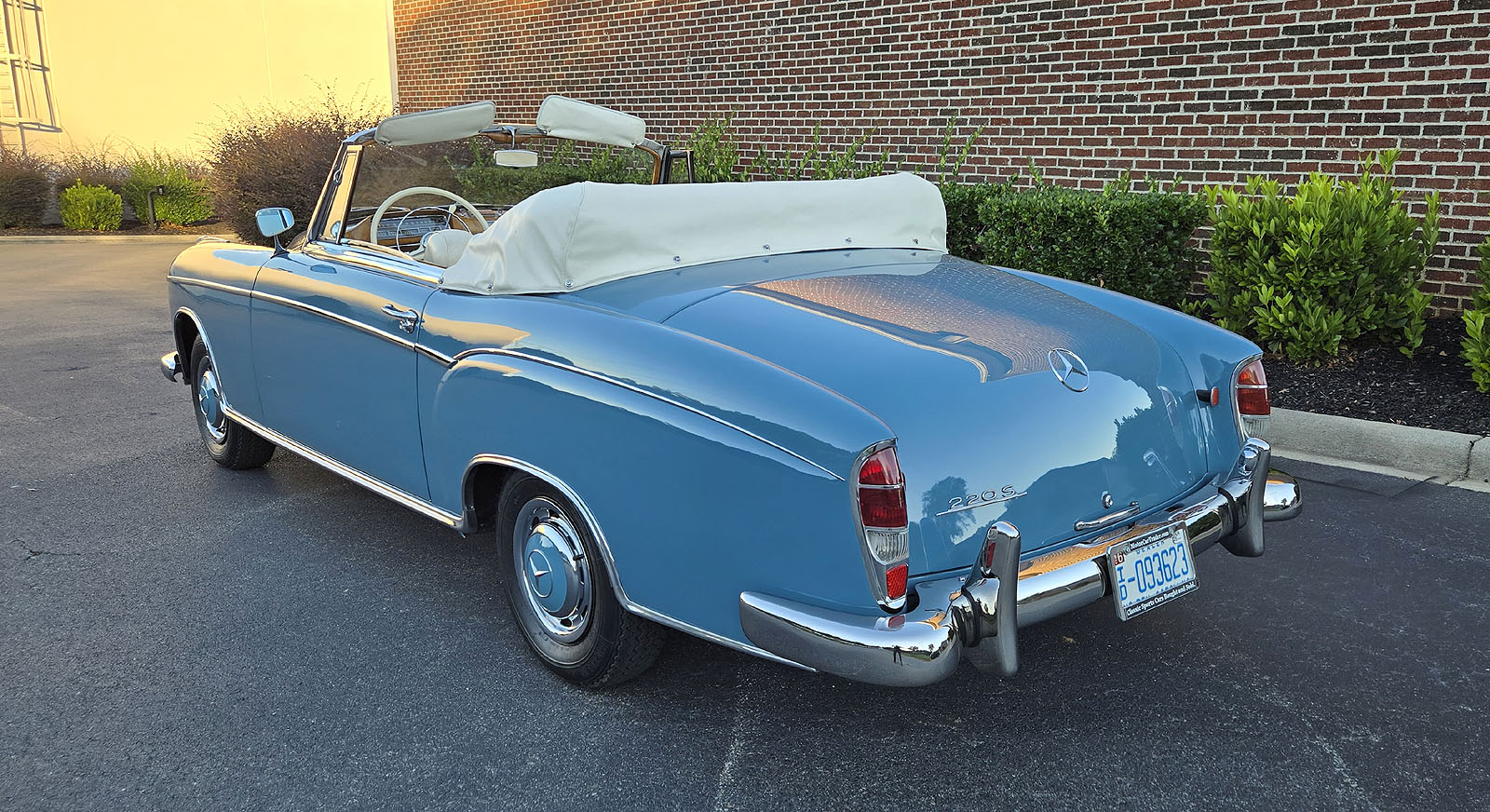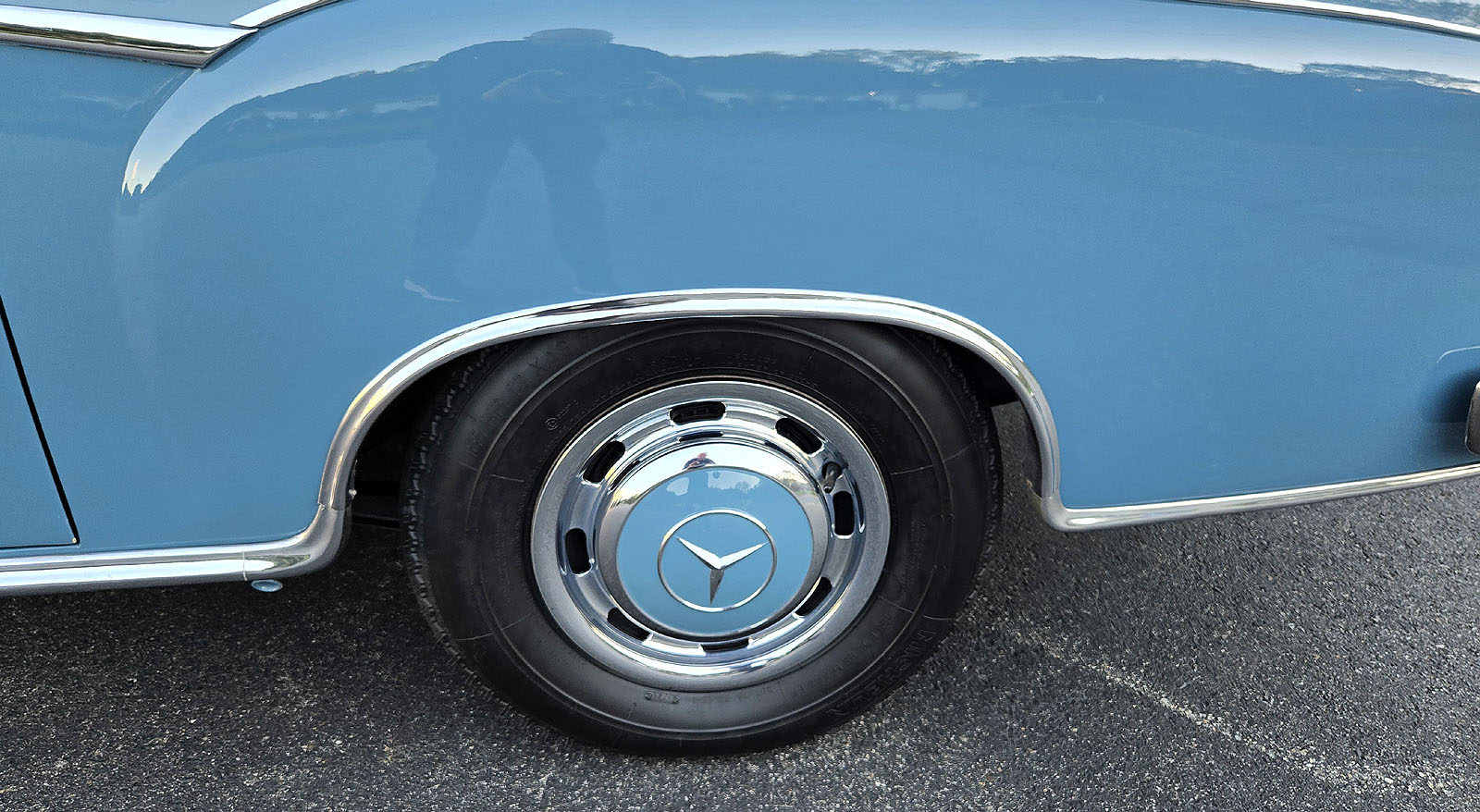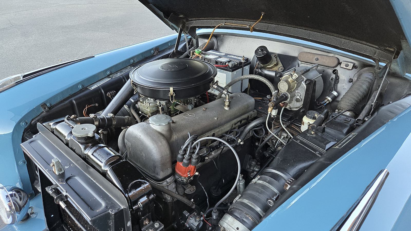We acquired this Mercedes Ponton from a Mercedes collector. The prior owner took excellent care of this car and presented the car at several car shows. Since our purchase, we have completed some work to improve the overall condition of the car both cosmetically and mechanically. We purchased new Michelin 185 R13 radial tires. The new tires were balanced on the wheels, and an alignment was performed. In addition, we had to recore the original radiator, as it had a few leaks. A timing adjustment was performed, and the original carburetors were tuned and adjusted as needed. A tune up was done with spark plugs installed. We did check the compression when the spark plugs were replaced, and the result was excellent of 142 psi to 154 psi across all 6 cylinders. Furthermore, the driver side window mechanism needed repair and to be welded, so we properly addressed this as well. A new manual auxiliary fuel pump was installed for easier starting function. We installed a new rear end seal, where the drive shaft meets the rear differential as it was leaking. This Mercedes-Benz went through an extensive detail with the interior cleaned, leather extensively refreshed/protected and cleaned. The exterior of the car was detailed, buffed and polished as well. All chrome on the car was polished by hand. The canvas soft top was also cleaned with fabric cleaner. Lastly, the underside was wiped down and cleaned, where there is no rust anywhere on this gorgeous Mercedes 220S.