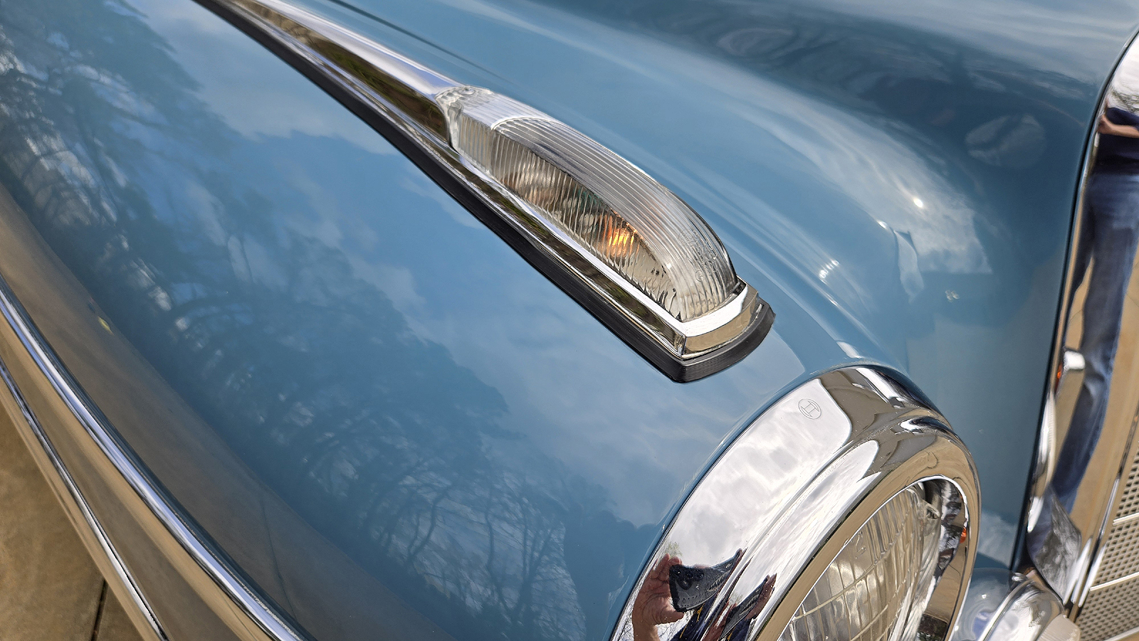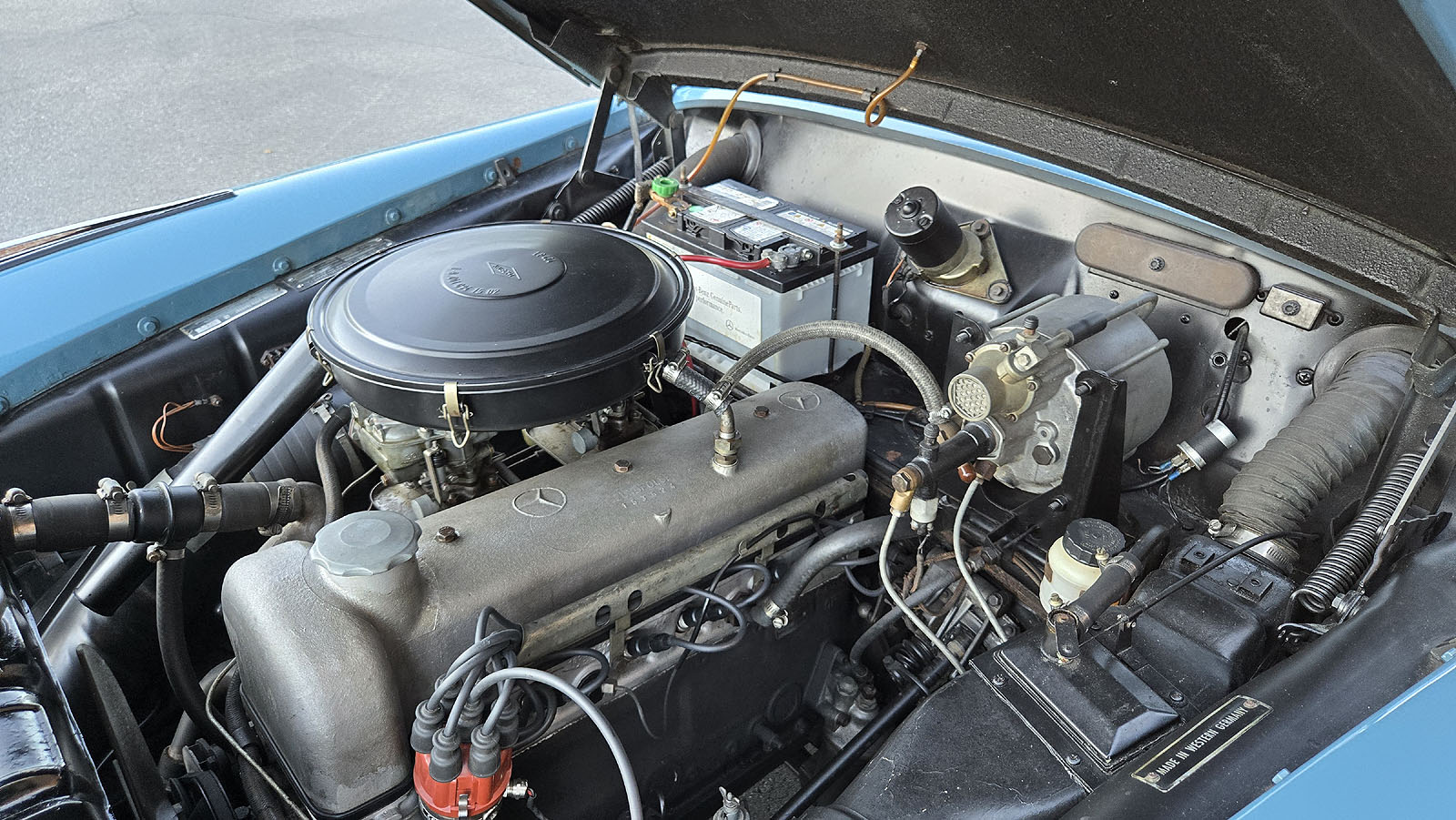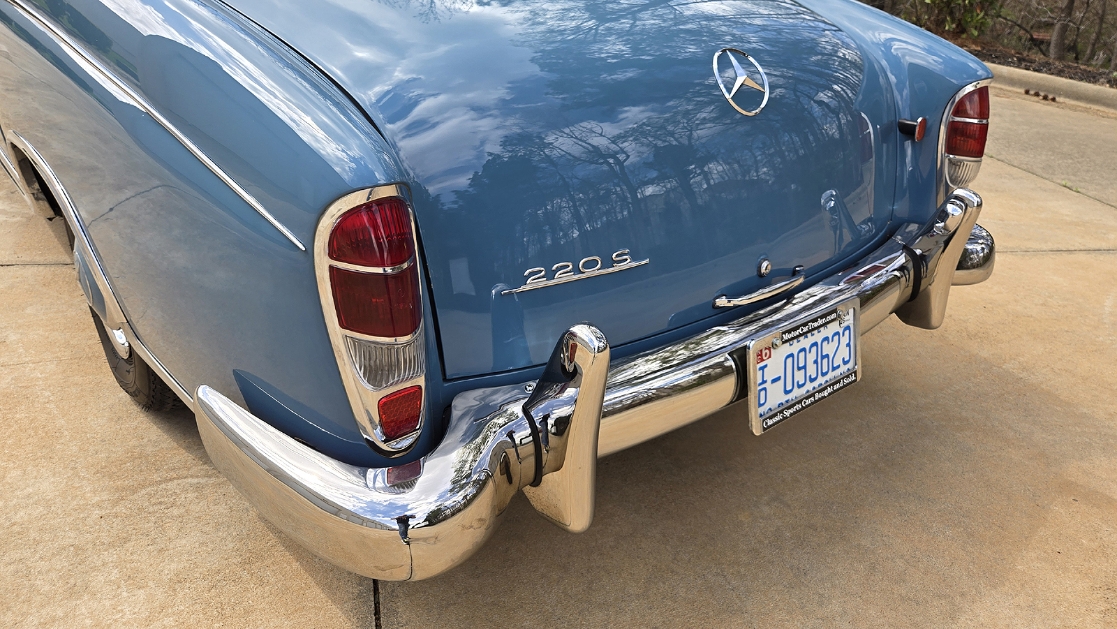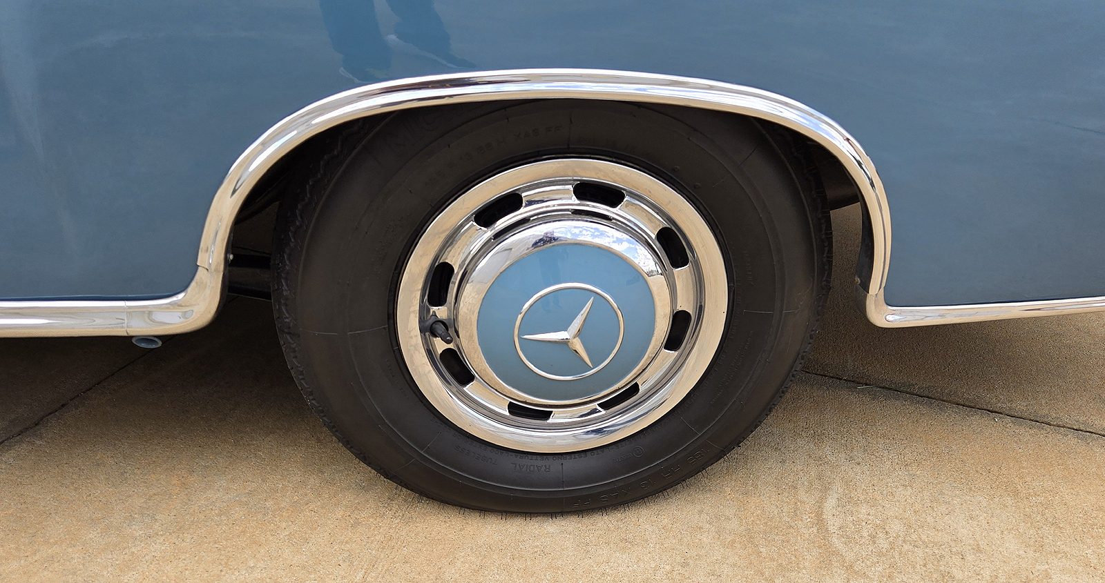 We acquired this Mercedes Ponton from a Mercedes collector. The prior owner took excellent care of this car and presented the car at several car shows. Since our purchase, we have completed some work to improve the overall condition of the car both cosmetically and mechanically. We purchased new Michelin 185 R13 radial tires. The new tires were balanced on the wheels, and an alignment was performed. In addition, we had to recore the original radiator, as it had a few leaks. A timing adjustment was performed, and the original carburetors were tuned and adjusted as needed. A tune up was done with spark plugs installed. We did check the compression when the spark plugs were replaced, and the result was excellent of 142 psi to 154 psi across all 6 cylinders. Furthermore, the driver side window mechanism needed repair and to be welded, so we properly addressed this as well. A new manual auxiliary fuel pump was installed for easier starting function. We installed a new rear end seal, where the drive shaft meets the rear differential as it was leaking. This Mercedes-Benz went through an extensive detail with the interior cleaned, leather extensively refreshed/protected and cleaned. The exterior of the car was detailed, buffed and polished as well. All chrome on the car was polished by hand. The canvas soft top was also cleaned with fabric cleaner. Lastly, the underside was wiped down and cleaned, where there is no rust anywhere on this gorgeous Mercedes 220S.