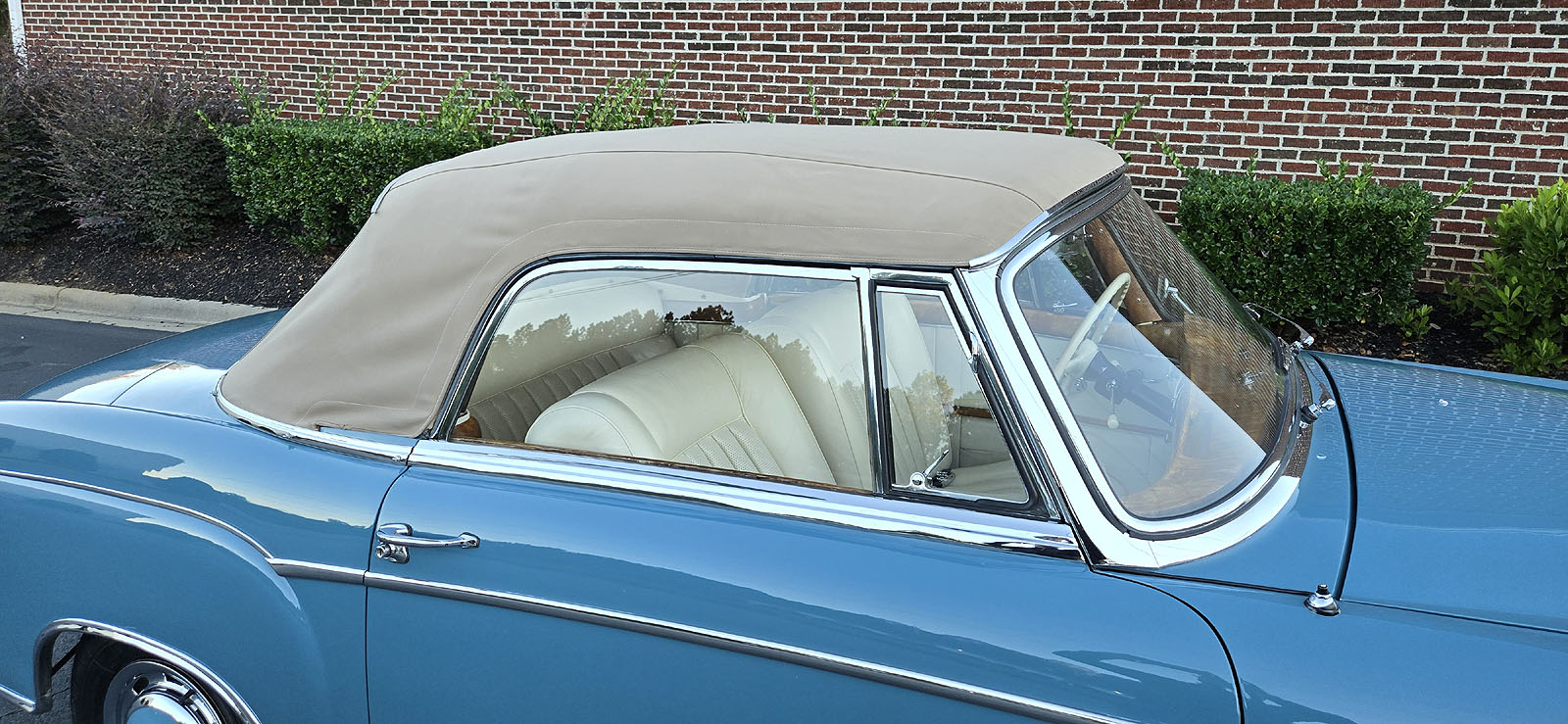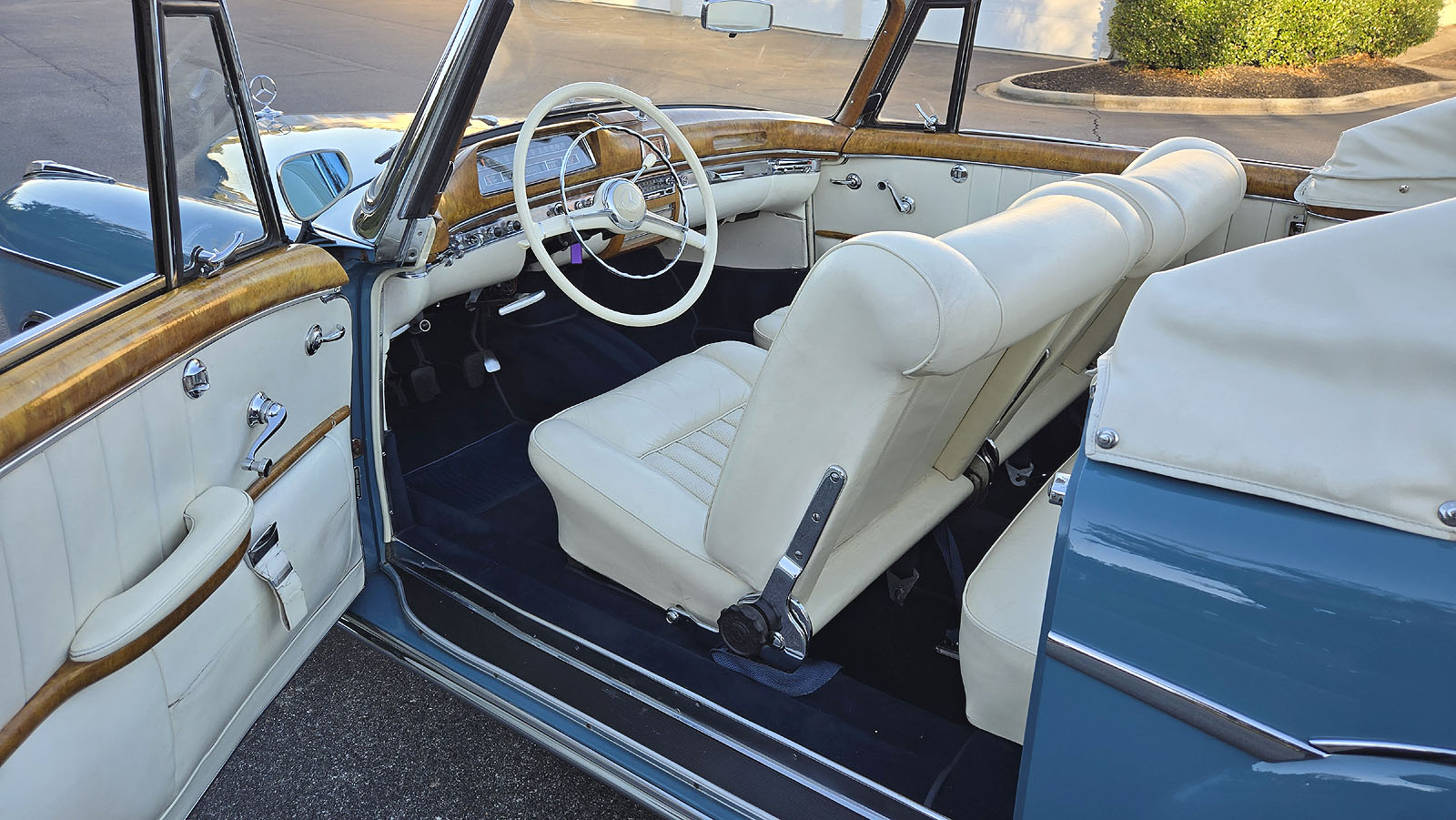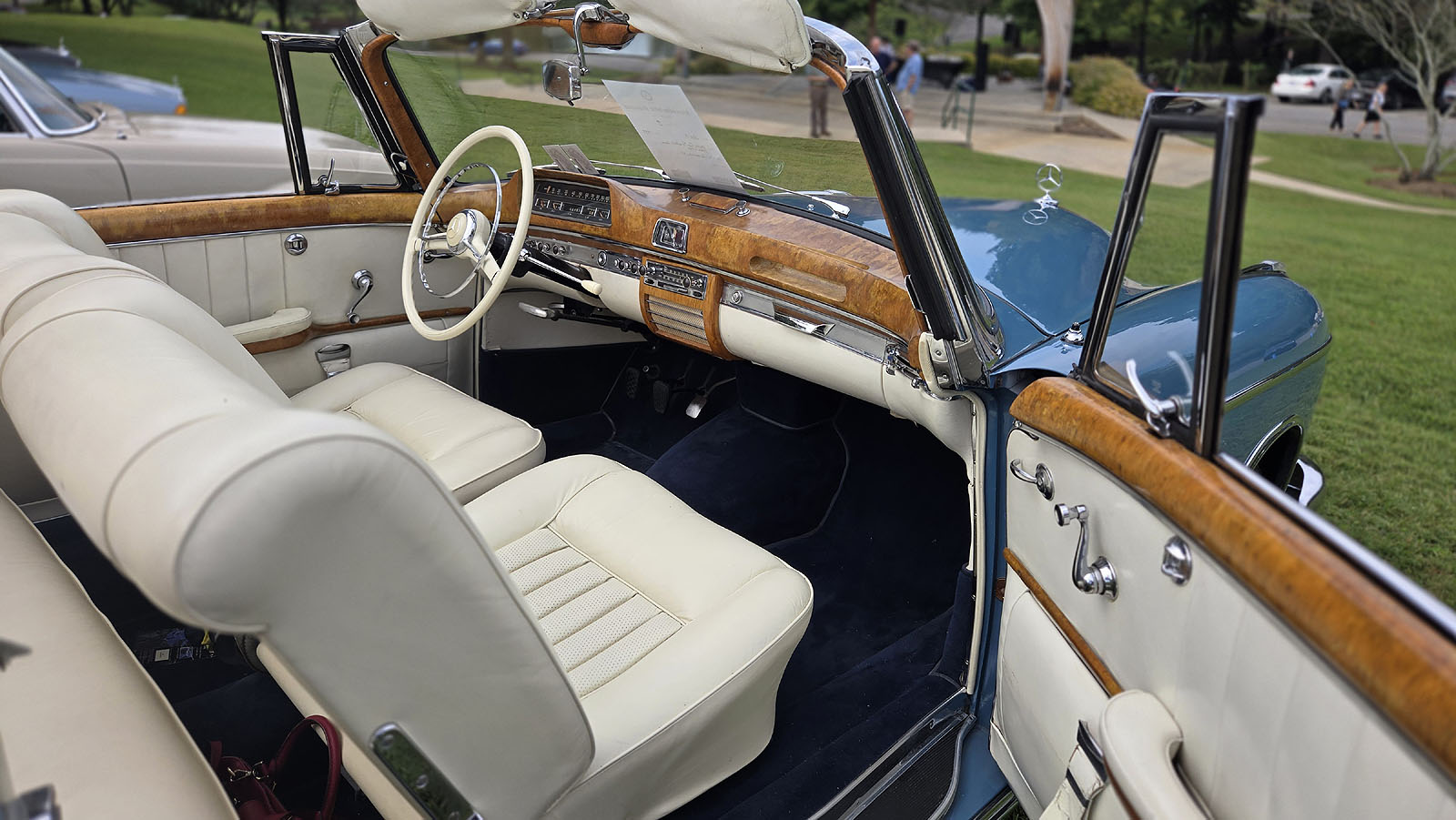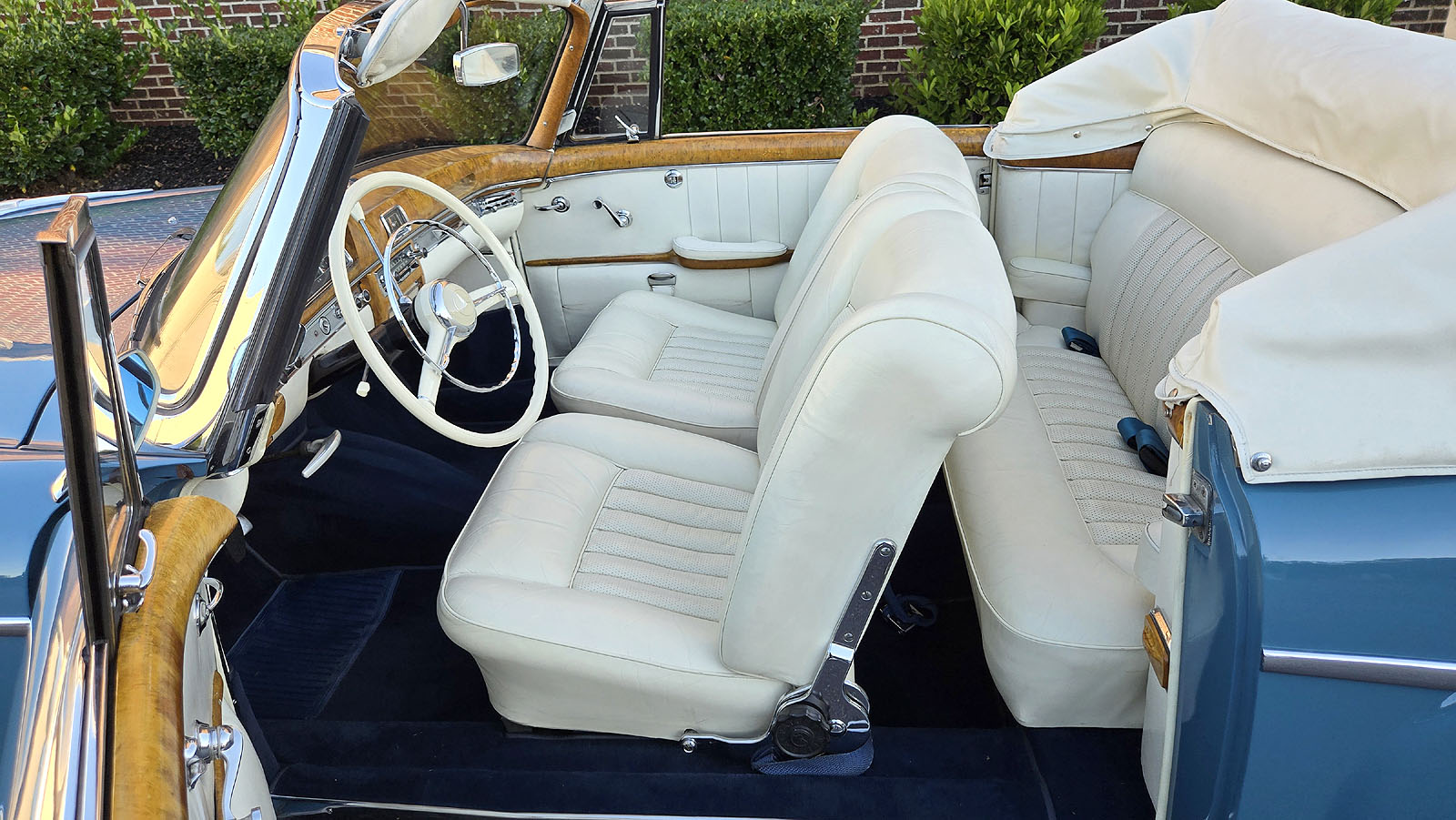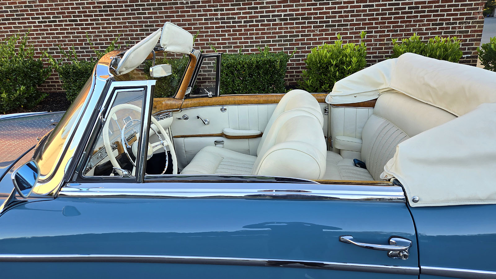 We drove this car extensively and about 300 plus miles, showing and driving the car at the 2025 Shelton Vineyards Mercedes-Benz show at highways speeds of 80mph. In addition, driving it to local car gatherings, as well as driving it around town. It is exceptional to drive. The column 4-speed shifter engages perfectly, and clutch feels great with no shutter. The engine is quiet as can be with no valve train noises or unusual noises. In addition, the car has excellent power and can keep up with modern traffic but to be forewarned this car attracts a lot of attention. The power steering also feels strong and the car drives straight and does not wonder going down the road at all. This Ponton holds temperature well and the cream seats keep the car cool. The brakes on this car stop straight, as they should and it does not pull in either direction. The soft top has a nice zip outside window which provides a nice air floor when driving with the convertible top. The seats in this car are so unbelievably comfortable, so that when you are driving you actual forget that you are driving in a nearly 70-year-old Mercedes-Benz. There is adequate room for 4 adults in this car as well. This wonderful Mercedes-Benz 220S Cabriolet can be shown, but it is a high-level driver/show car and is a great driver’s car as it really shines nicely on the road. It needs and should be driven as all our cars need to be. The next owner will be sure to have plenty of miles of driving enjoyment and touring with this exceptional 1959 Mercedes 220S Cabriolet “Ponton.”
