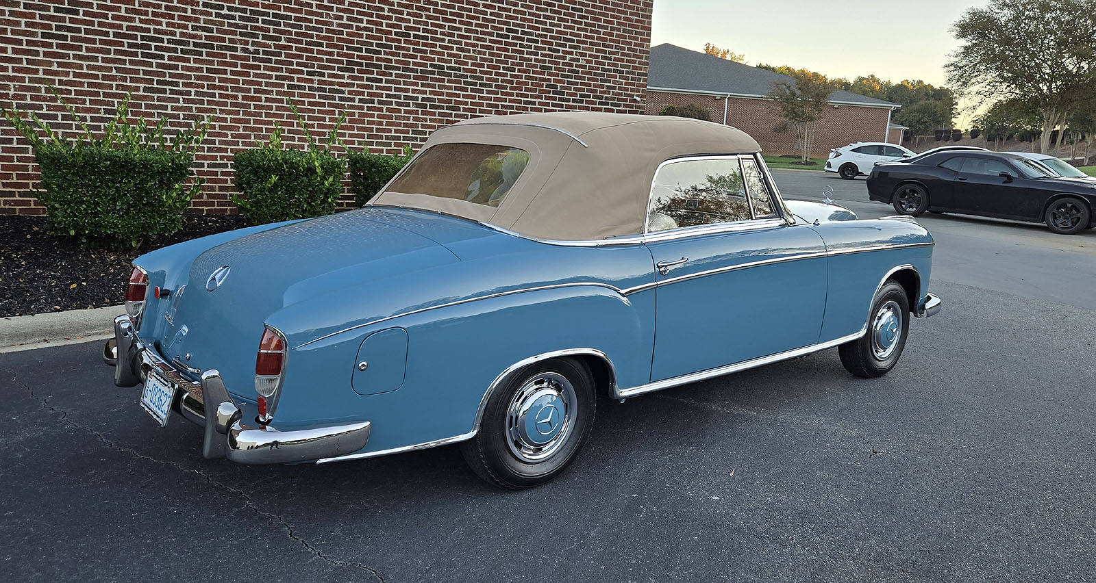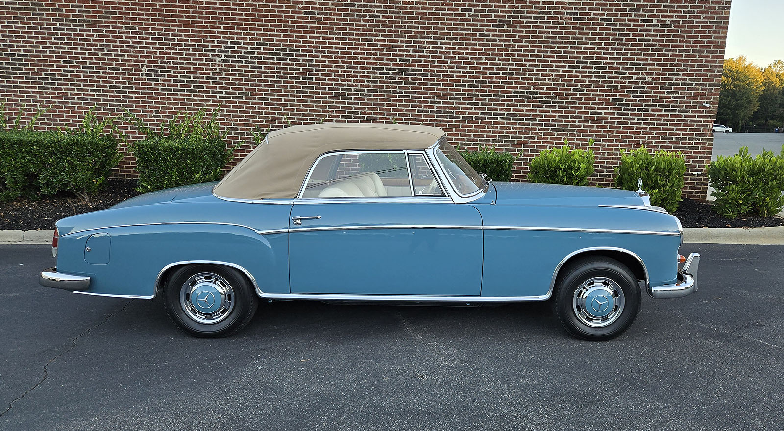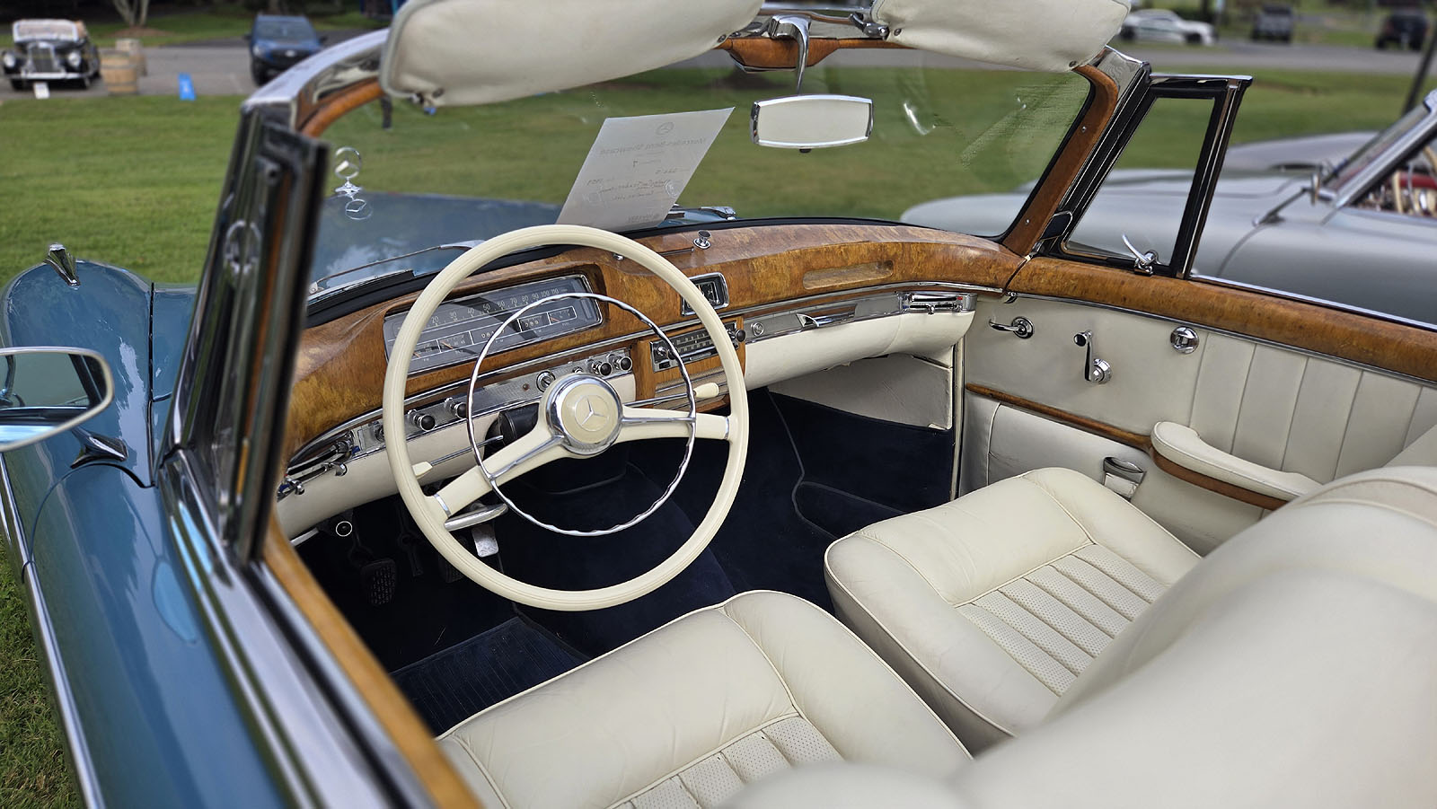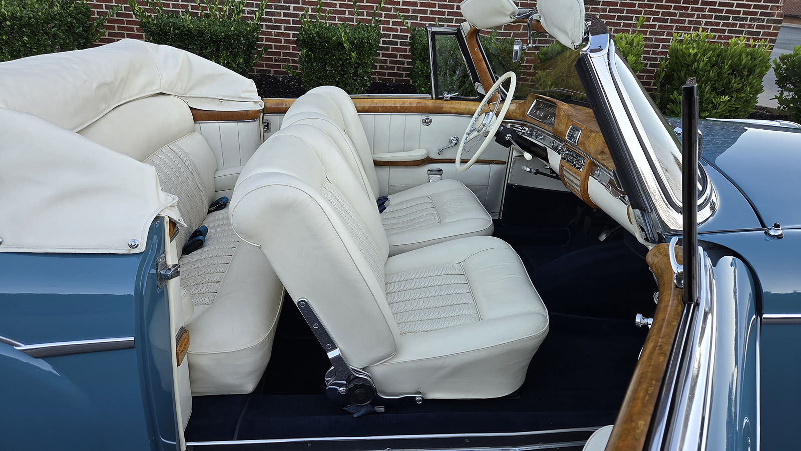 We drove this car extensively and about 300 plus miles, showing and driving the car at the 2025 Shelton Vineyards Mercedes-Benz show at highways speeds of 80mph. In addition, driving it to local car gatherings, as well as driving it around town. It is exceptional to drive. The column 4-speed shifter engages perfectly, and clutch feels great with no shutter. The engine is quiet as can be with no valve train noises or unusual noises. In addition, the car has excellent power and can keep up with modern traffic but to be forewarned this car attracts a lot of attention. The power steering also feels strong and the car drives straight and does not wonder going down the road at all. This Ponton holds temperature well and the cream seats keep the car cool. The brakes on this car stop straight, as they should and it does not pull in either direction. The soft top has a nice zip outside window which provides a nice air floor when driving with the convertible top. The seats in this car are so unbelievably comfortable, so that when you are driving you actual forget that you are driving in a nearly 70-year-old Mercedes-Benz. There is adequate room for 4 adults in this car as well. This wonderful Mercedes-Benz 220S Cabriolet can be shown, but it is a high-level driver/show car and is a great driver’s car as it really shines nicely on the road. It needs and should be driven as all our cars need to be. The next owner will be sure to have plenty of miles of driving enjoyment and touring with this exceptional 1959 Mercedes 220S Cabriolet “Ponton.”