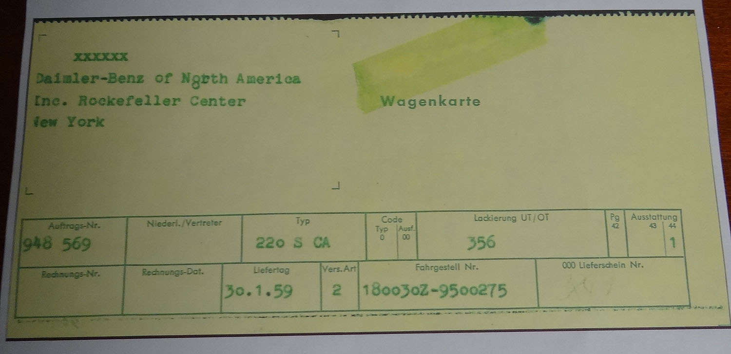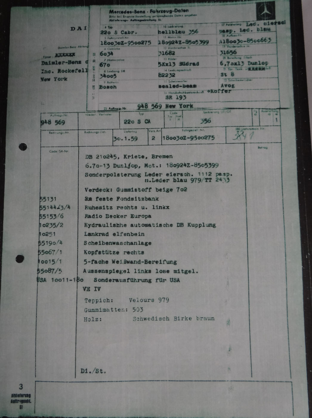 We are thrilled to offer this stunning 1959 Mercedes-Benz 220S “Ponton” W180 Cabriolet . This wonderful example was originally delivered on January 1st of 1959 to Daimler-Benz of North America. We do have the original Mercedes-Benz Data card to confirm all numbers and the original color for this great car. We also have the original books, owner’s manual and such which went with this car when it was new. The 220S presented here was previously restored in its original color hellbleu DB356 (light blue) and is complemented by its original cream leather color with dark blue carpets and Schwedish Birke braun (Swedish Birch Brown Wood).