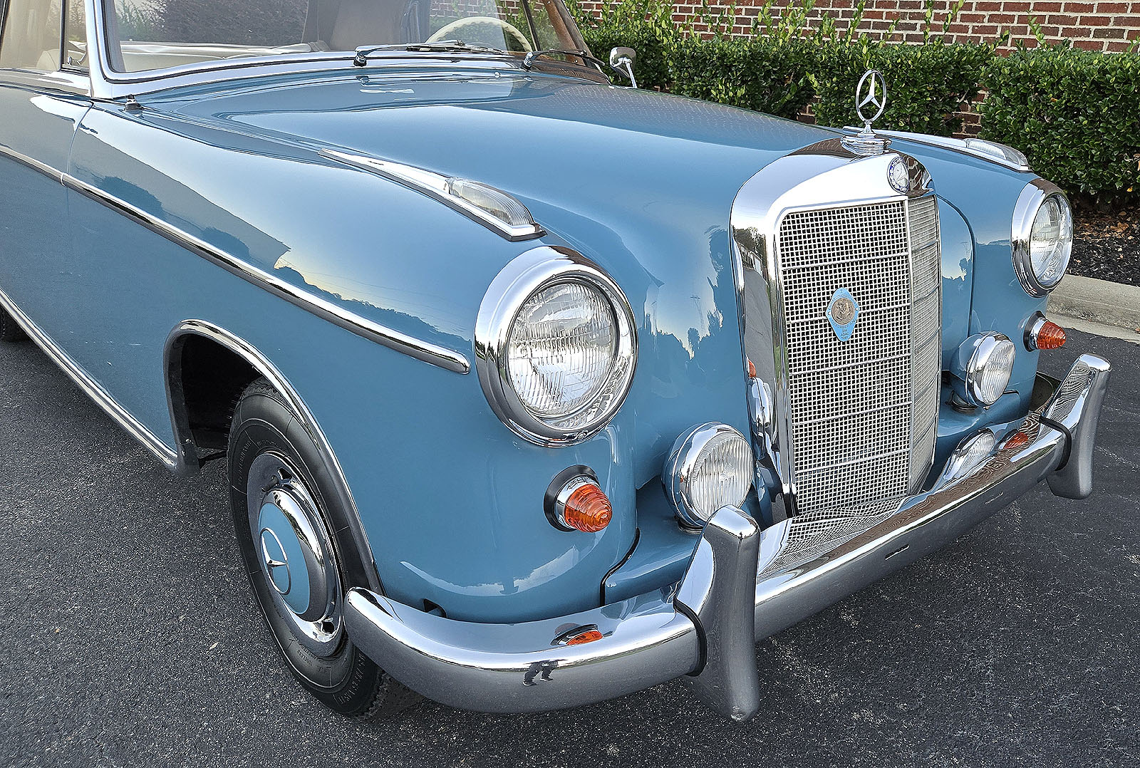 We are thrilled to offer this stunning 1959 Mercedes-Benz 220S “Ponton” W180 Cabriolet . This wonderful example was originally delivered on January 1st of 1959 to Daimler-Benz of North America. We do have the original Mercedes-Benz Data card to confirm all numbers and the original color for this great car. We also have the original books, owner’s manual and such which went with this car when it was new. The 220S presented here was previously restored in its original color hellbleu DB356 (light blue) and is complemented by its original cream leather with dark blue carpets and Schwedish Birke braun (Swedish Birch Brown Wood), in which is remarkably in excellent original condition.